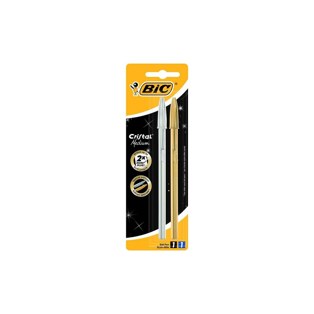 Bic Cristal Shine Pack de 2 Boligrafos de Bola - Punta Media de 1.0mm - Tinta con Base de Aceite - Cuerpo Plateado y Dorado - Co