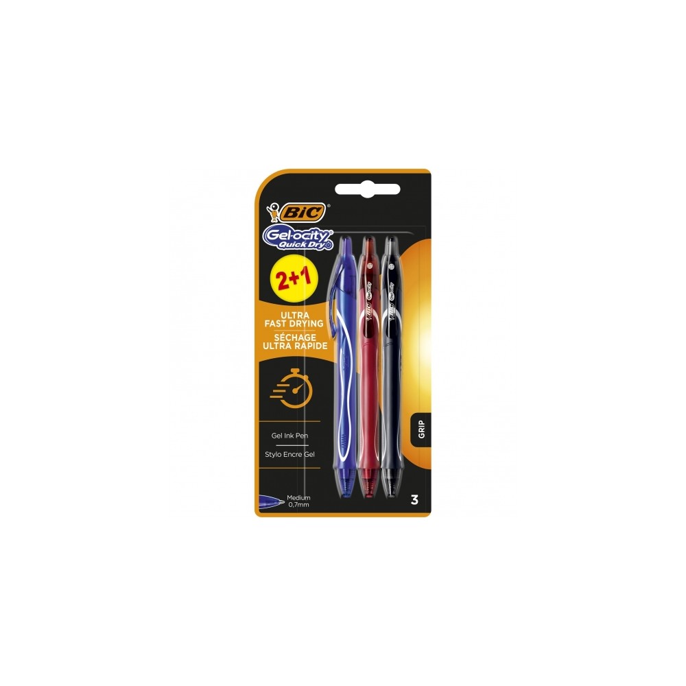 Bic Gel-Ocity Quick Dry 2+1 Pack de 3 Boligrafos Retractiles - Grip de Goma - Punta Media de 0.7mm - Secado Ultra Rapido - No Ma