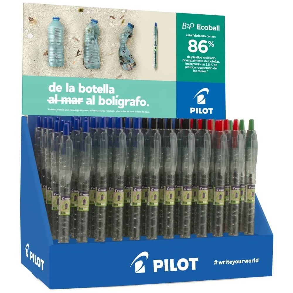 Pilot Expositor 60 Boligrafos de Bola Retractiles B2P Ecoball BeGreen + 10 B2P Gel BeGreen - 86,64% de Plastico Reciclado - Reca Ver más grande