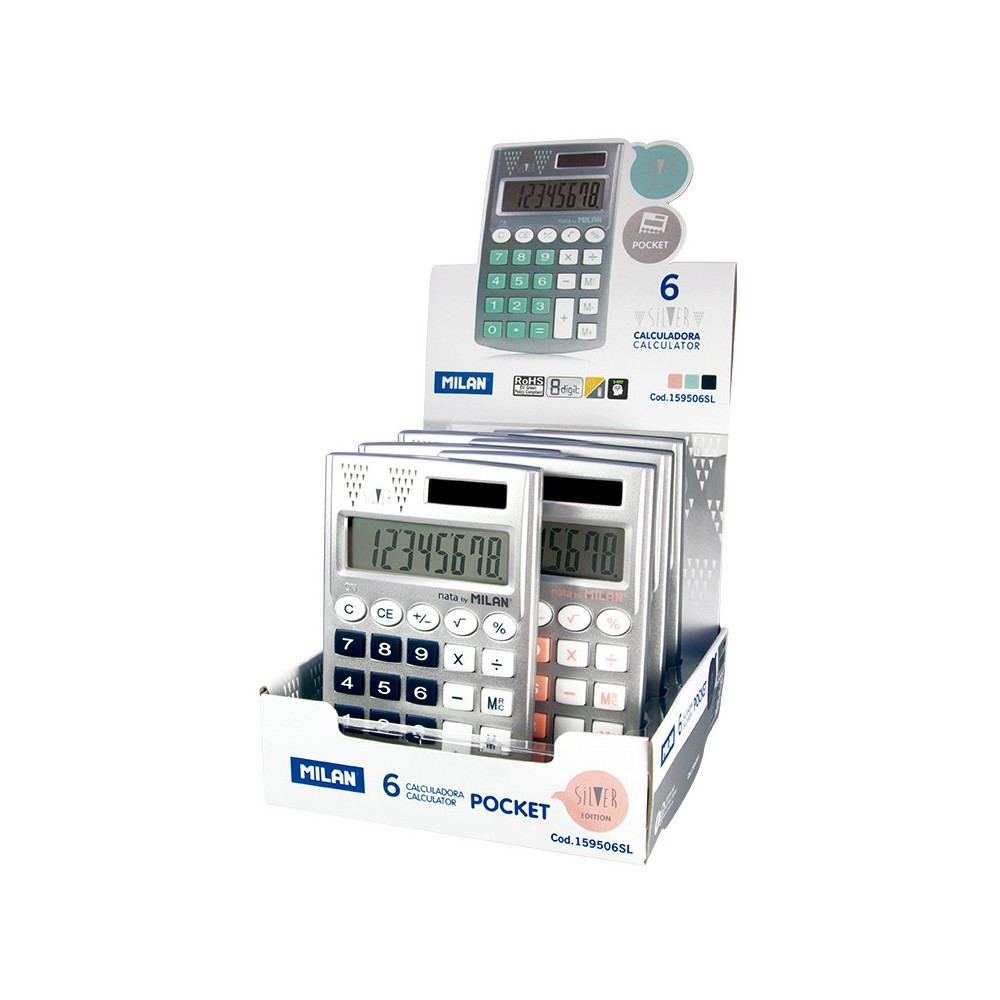 Milan Pocket Silver Expositor de 6 Calculadoras de Bolsillo 8 Digitos - Tacto Suave - 3 Teclas de Memoria y Raiz Cuadrada - Apag