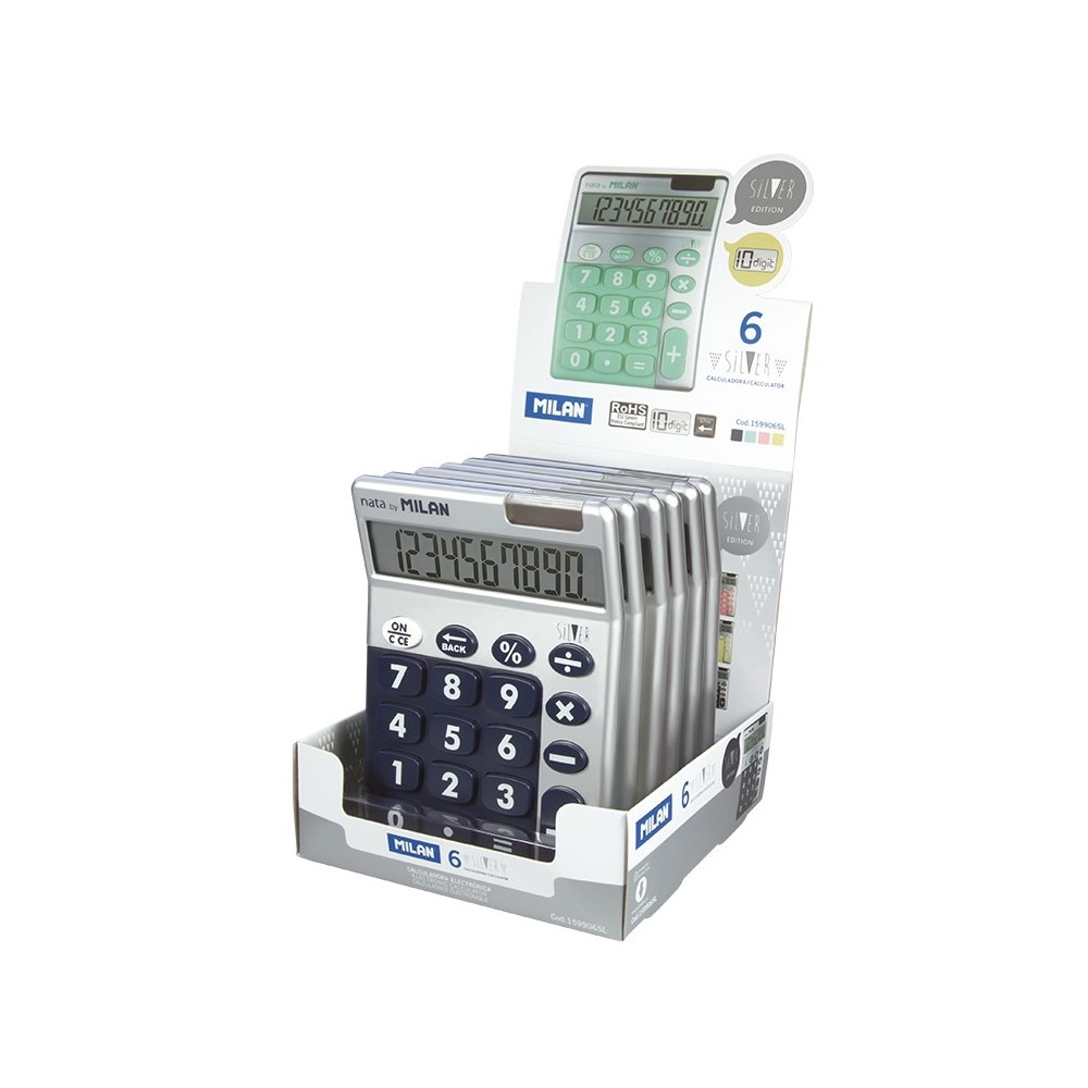 Milan Expositor de 6 Calculadoras 10 Digitos Silver - Calculadora de Sobremesa - Teclas Grandes - Tecla Rectificacion Entrada de