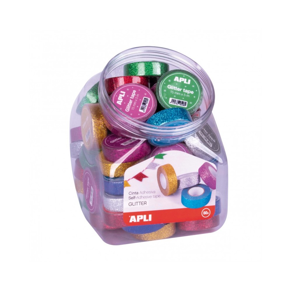 Apli Expositor con 60 Cintas Adhesivas Glitter Opacas 15 mm x 5 m - Facil de Cortar - Colores Surtidos