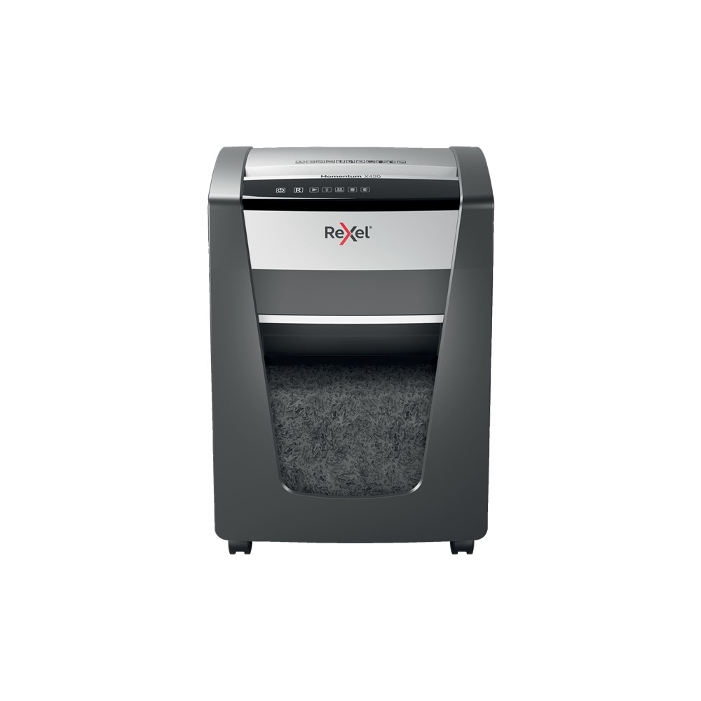 ¡La potencia para destruir más! La destructora de papel Rexel Momentum X420 destruye hasta 20 hojas de una vez, funciona ininterrumpidamente durante 4 horas y es ideal para oficinas pequeñas. La tecnología antiatasco del modelo X420 garantiza el funcionamiento ininterrumpido. P4, corte cruzado (partículas de 4 × 40 mm). Trituradora silenciosa con botones táctiles sencillos e intuitivos y una generosa papelera de 30 litros de capacidad (275 hojas A4).
