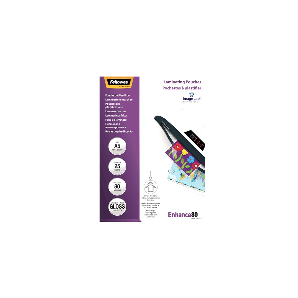 Fellowes Pack de 25 Fundas para Plastificar Brillo A5 - 80 Micras - Alta Calidad - Transparente