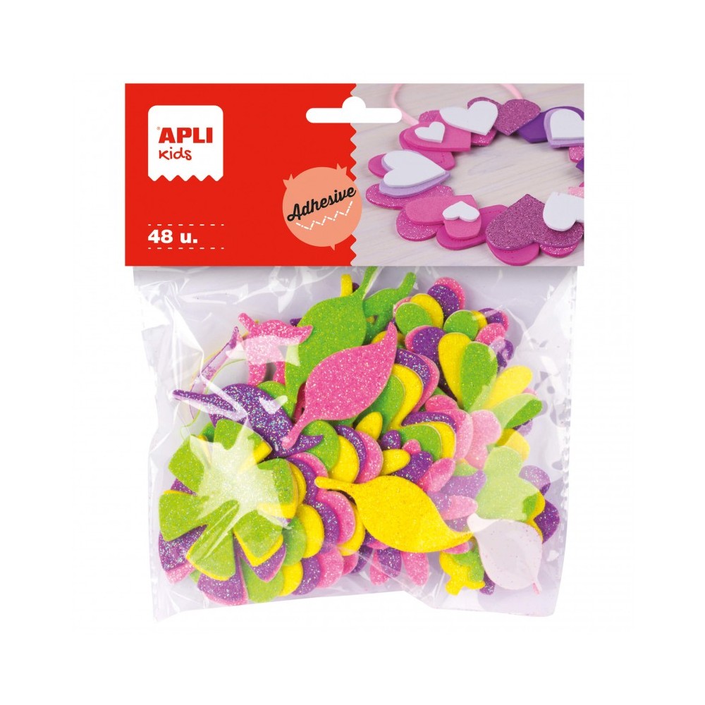 Apli Formas de Flor Adhesivas de Goma Eva - 48 Formas - Medidas Surtidas - Material Suave y Seguro - Colores Surtidos Purpurina