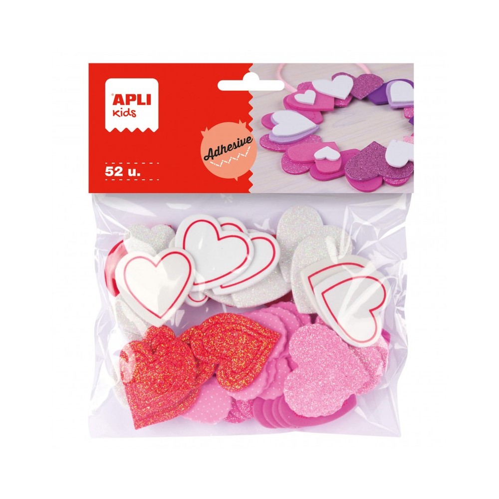 Apli Formas de Corazones Adhesivas de Goma Eva - 52 Formas - Medidas Surtidas - Material Suave y Seguro - Colores Surtidos Purpu