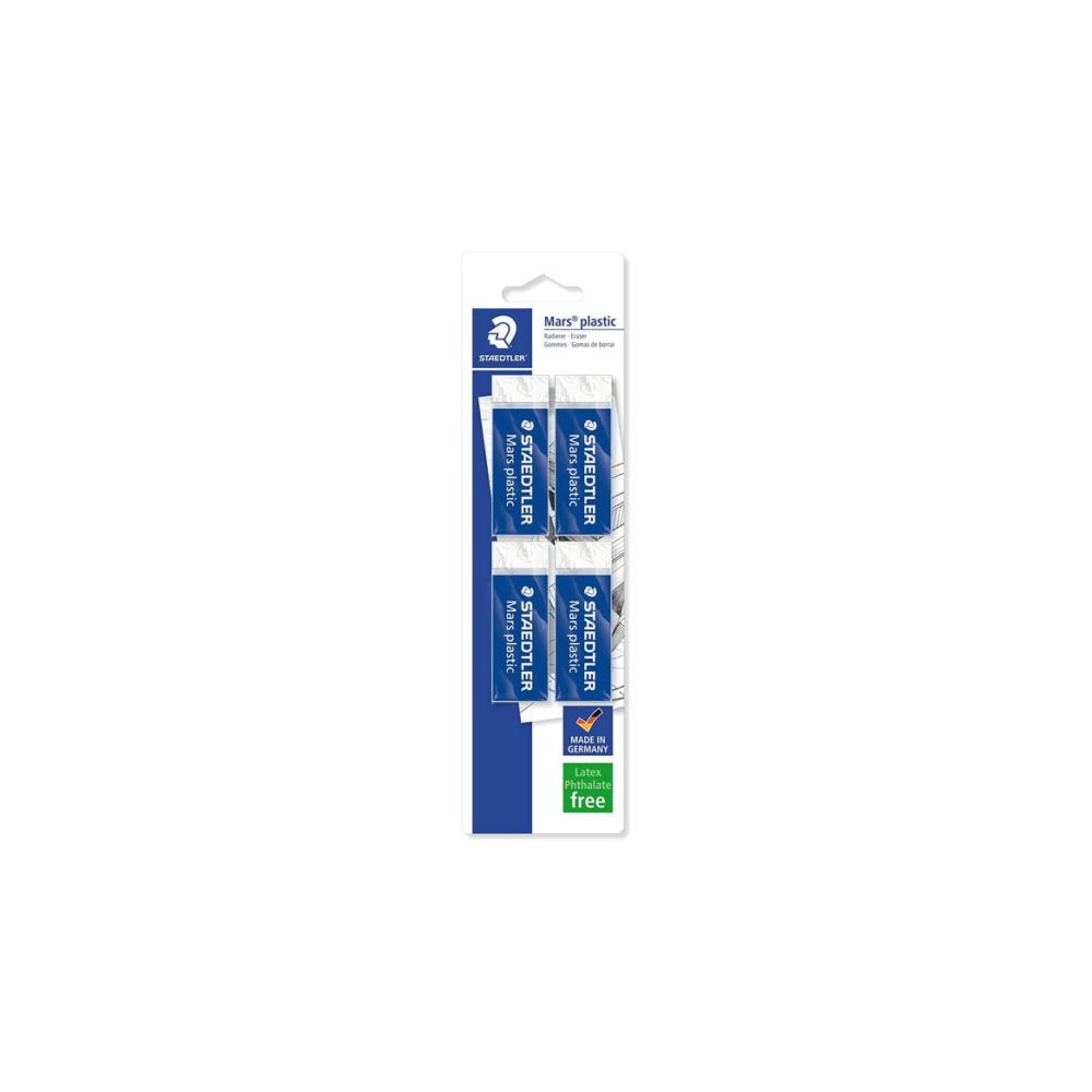 -Blíster con 4 unidades de gomas de borrar blancas con faja de cartón; Fabricadas en Alemania.