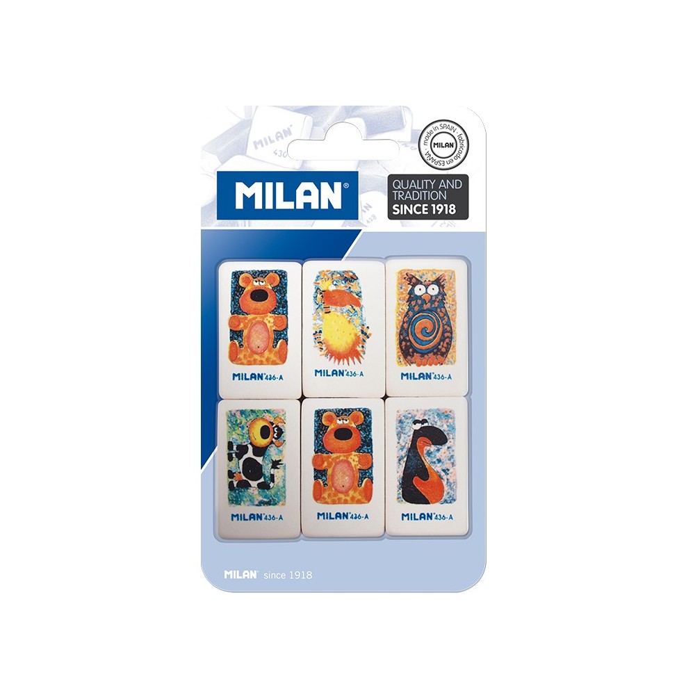 Milan 436A Pack de 6 Gomas de Borrar Rectangulares - Miga de Pan - Caucho Suave Sintetico - Dibujos Infantiles Surtidos - Color