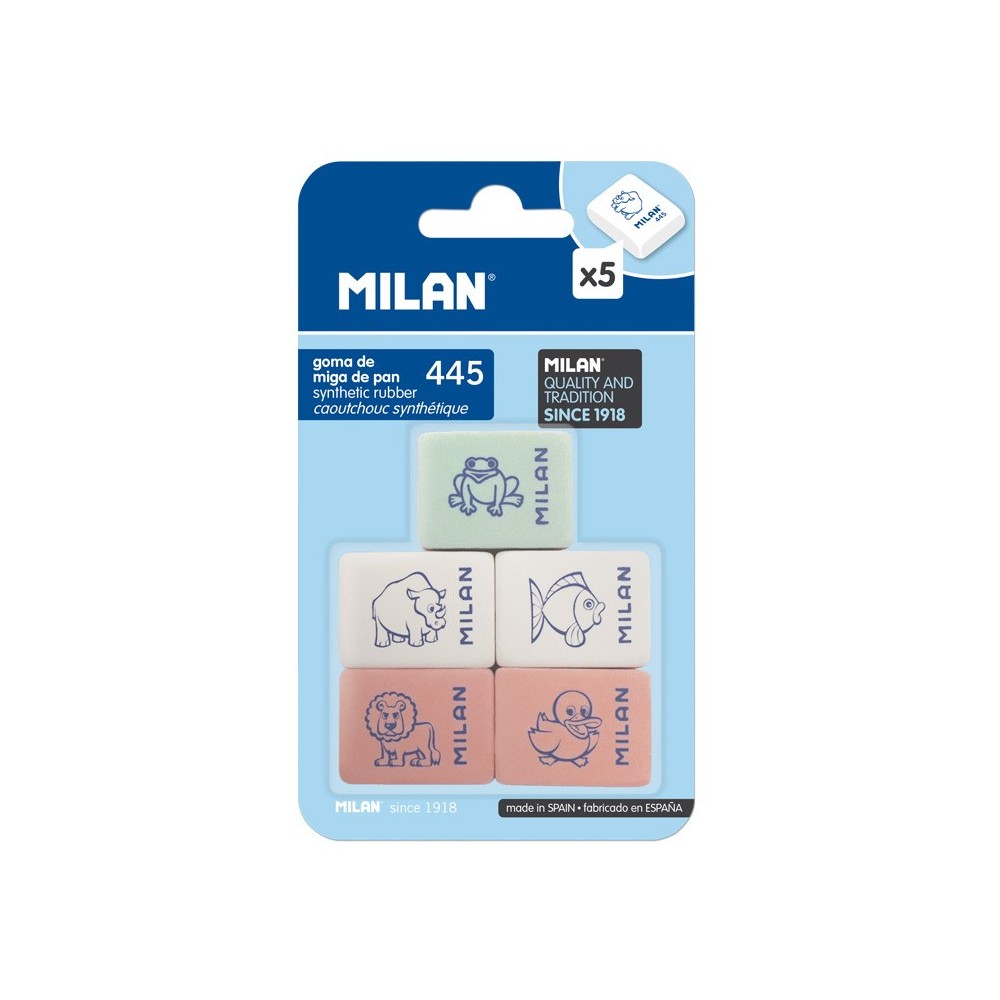 Milan 445 Pack de 5 Gomas de Borrar Rectangulares - Miga de Pan - Suave Caucho Sintetico - Dibujos Infantiles - Colores Surtidos Ver más grande