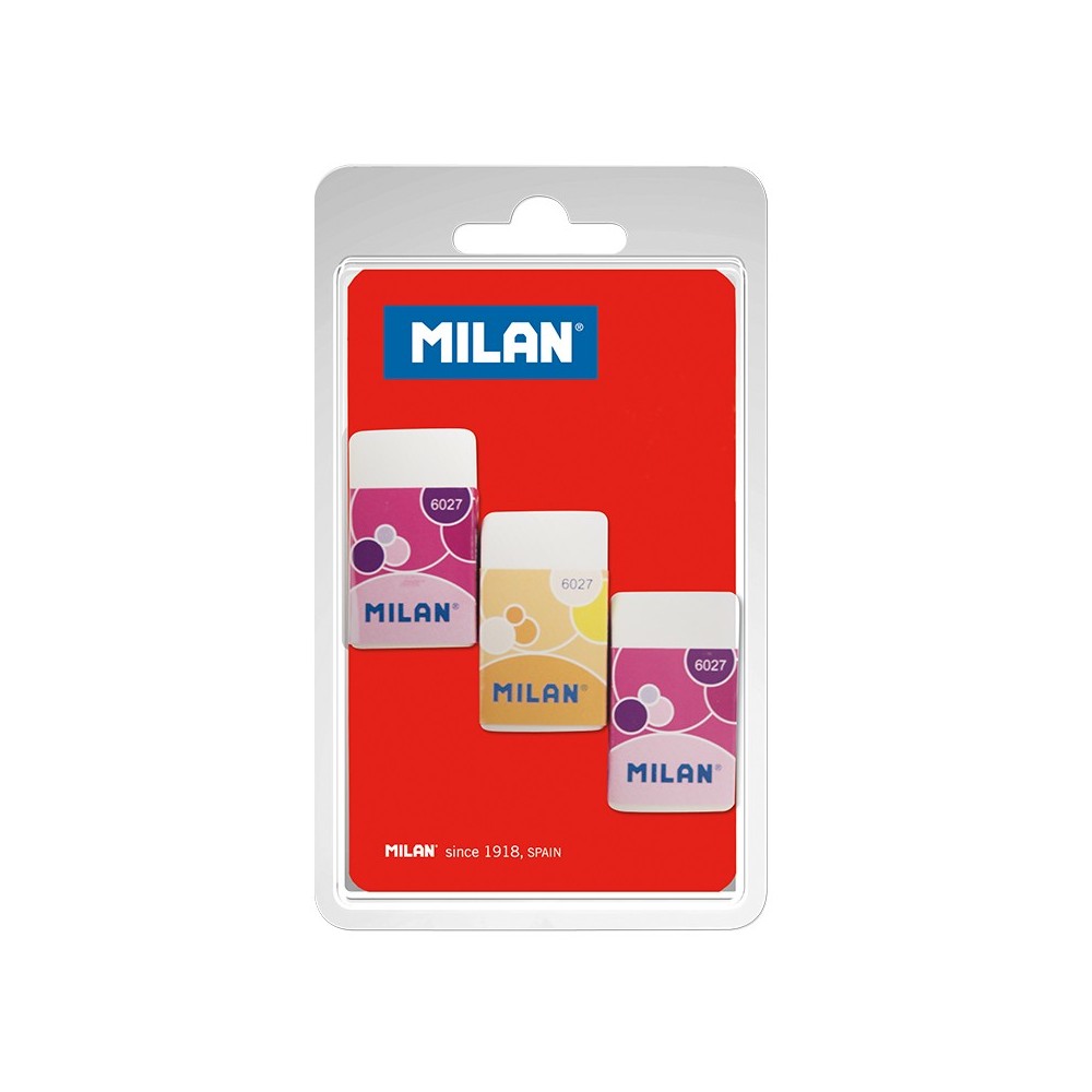 Milan Nata 6027 Pack de 3 Gomas de Borrar Rectangulares - Miga de Pan - Plastico - Faja de Carton en Colores Surtidos - Color Bl
