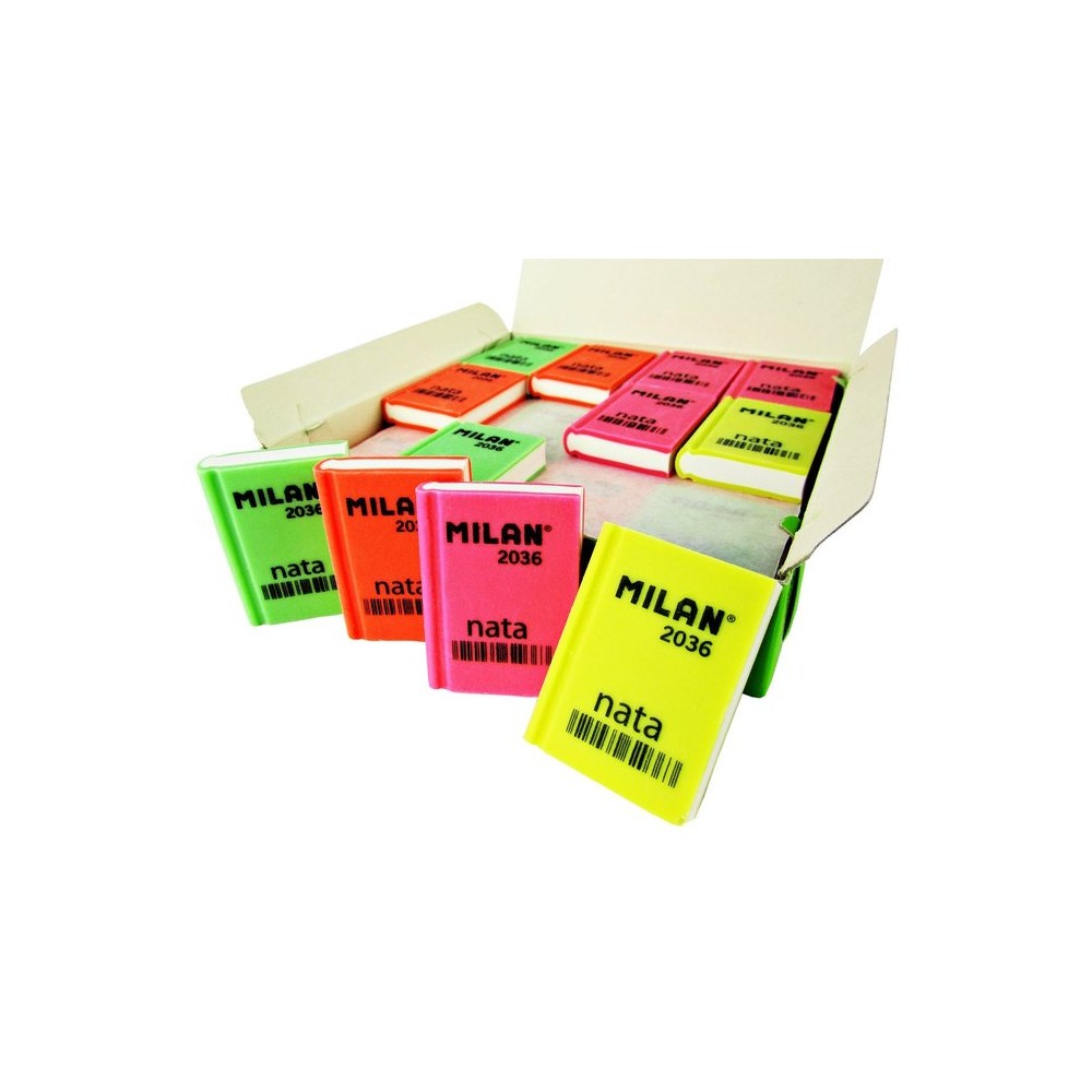 Milan Nata 2036 Goma de Borrar Rectangular - Plastico - Suave - Diseño Libro - Colores Fluorescentes Surtidos Ver más grande