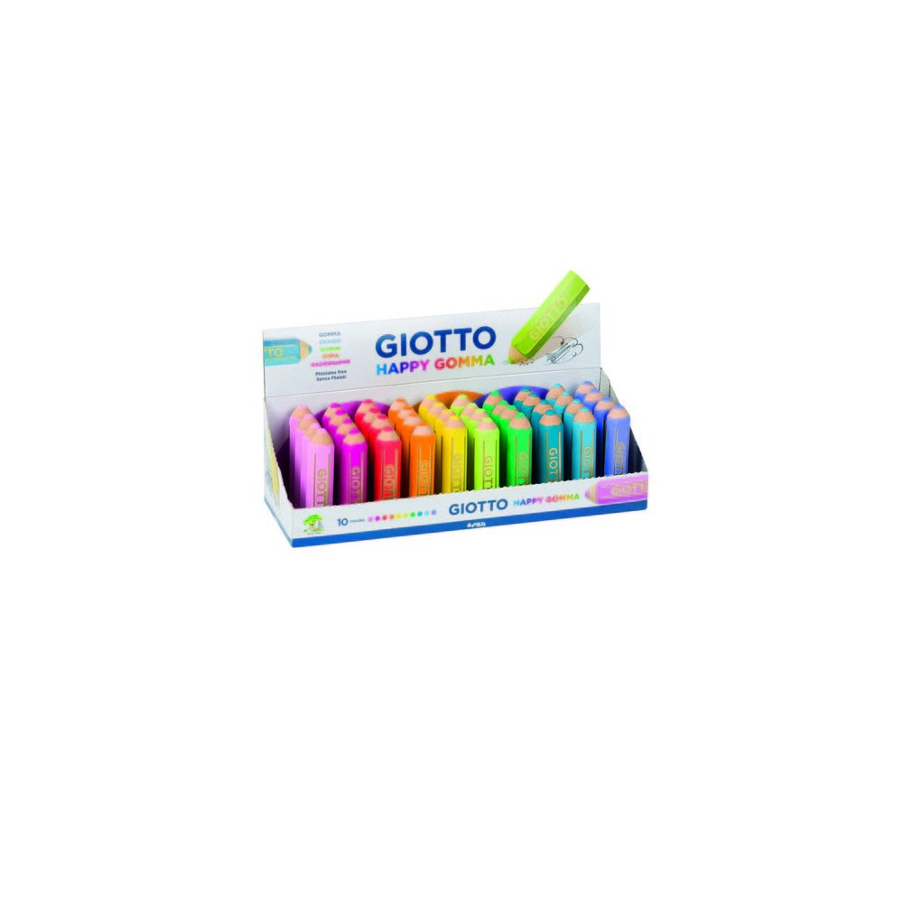 Giotto Happy Gomma Expositor de 40 Gomas de Borrar - Forma de Lapiz - Para Borrar Grafito - 10 Colores Fluo
