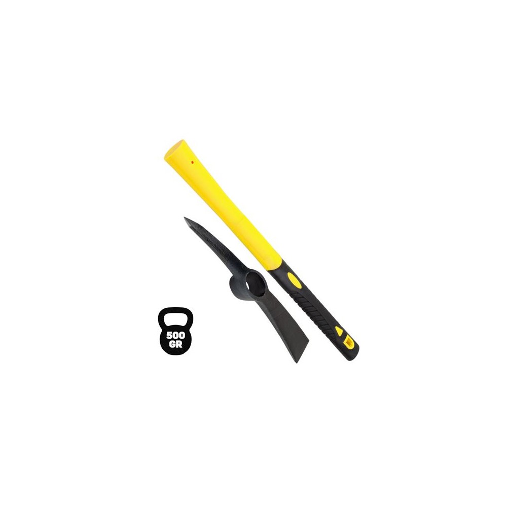 El producto es un martillo de 500 gramos con un mango de fibra de vidrio de alta calidad. Tiene una superficie engomada que proporciona mayor comodidad y ergonomía durante su uso. Las cabezas del martillo están hechas de acero forjado y tratado térmicamente, lo que garantiza su durabilidad y resistencia.
