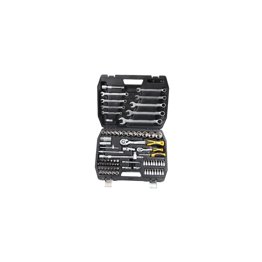 El conjunto de herramientas incluye una variedad de llaves combinadas, vasos de diferentes tamaños, cabezales con puntas de diferentes tipos, barras de extensión, mangos corredizos y destornilladores, adaptadores, chicharras con expulsor de vasos, entre otros. También se incluyen vasos de bujía, adaptadores de tres posiciones, una articulación universal y puntas de destornillador de diferentes tipos. Estas herramientas son ideales para realizar trabajos de reparación y mantenimiento en diferentes áreas.