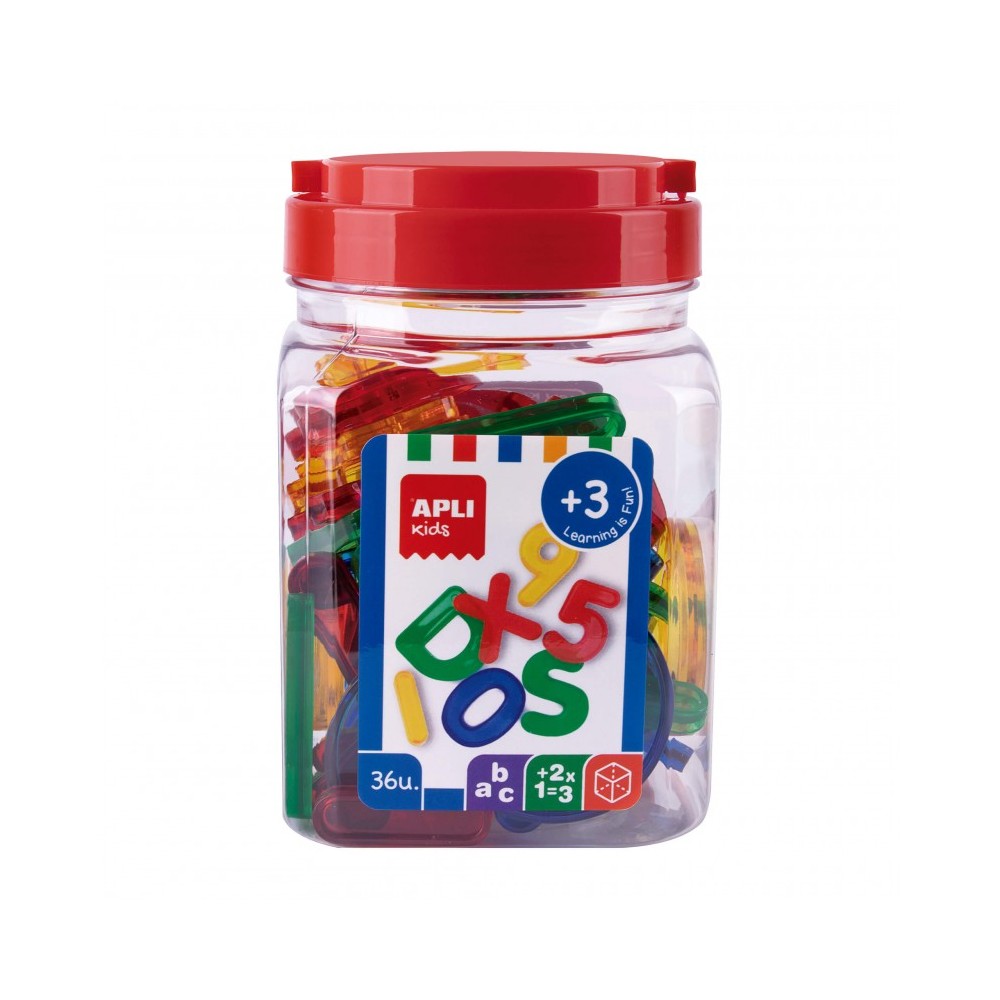 Kit con 36 números y letras de plástico transparente en diferentes colores: amarillo, rojo, verde y azul. Piezas de altura aproximada 50 mm. Su grueso y transparencia las hacen ideales para mesas de luz, así como para que los más pequeños empiecen a formar palabras y secuencias numéricas. Práctico formato MAXI, en bote con tapa, ideal para escuelas. Este tipo de juegos ayudan a entender y a utilizar los números y las letras, a experimentar causa y efecto, a trabajar el razonamiento deductivo e inductivo y la lógica, además de favorecer el uso del lenguaje escrito y oral. Recomendado para niños a partir de 3 años.