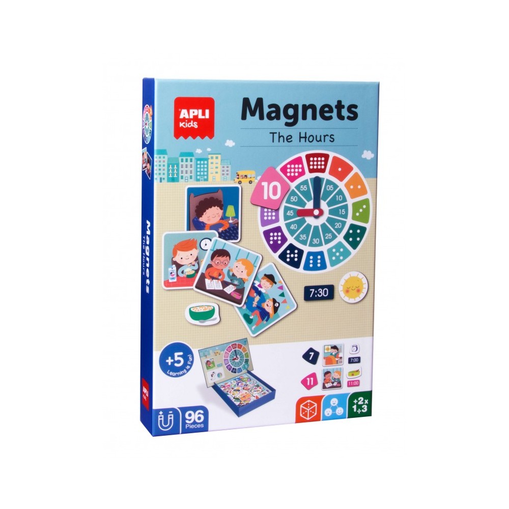 Cada juego contiene: 1 escenario imantado de 28 x 18 cm para encajar en la base de la caja y 96 fichas magnéticas con las diferentes partes del reloj y diferentes escenarios y rutinas diarias que facilitan el aprendizaje de las horas.