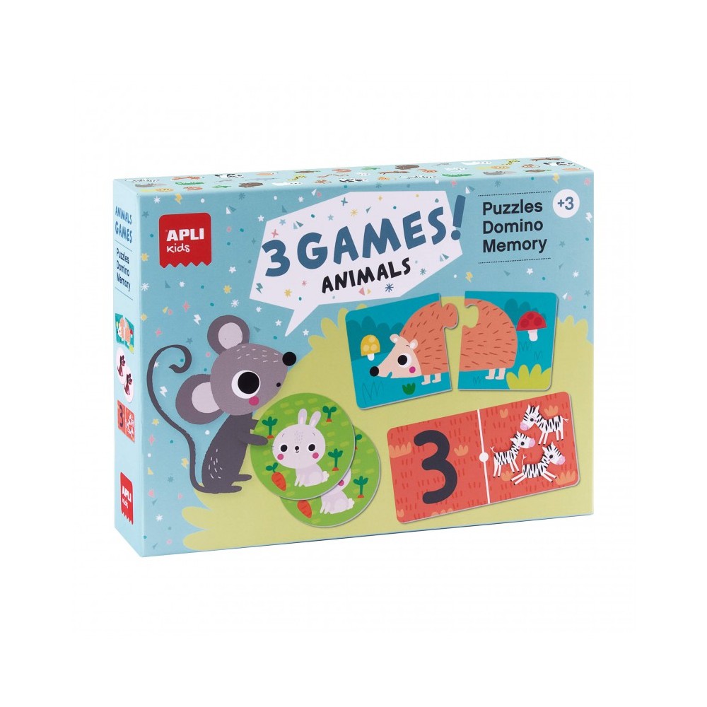 Apli Set de 3 juegos Animales: 1 Puzzle de 24 Piezas, 1 Domino de 36 Piezas y 1 Memory de 24 Piezas
