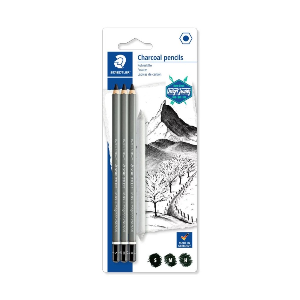 Staedtler Mars Lumograph Charcoal 100C Pack de 3 Lapices de Grafito + Difuminador - Alta Proporción de Carbon y Carboncillo - Gr