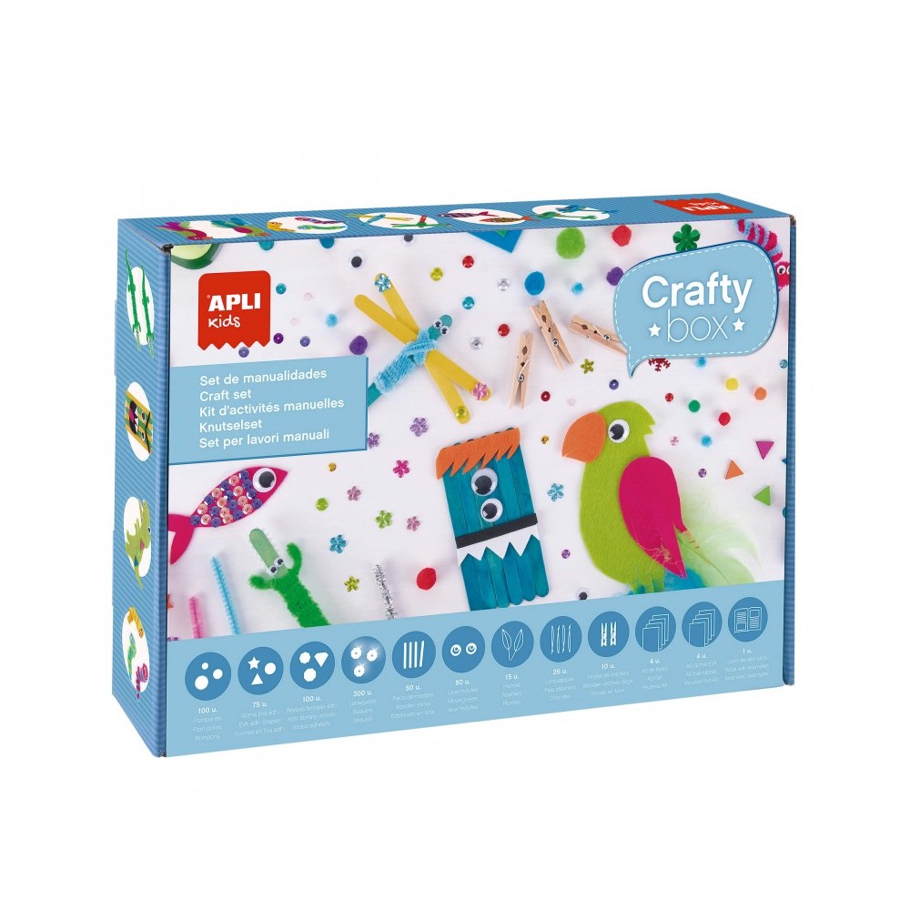 Apli Kids Pack de Manualidades con Pompones, Formas de Goma EVA, Piedras Fantasia Adhesivas, Lentejuelas, Palos de Madera, Ojos