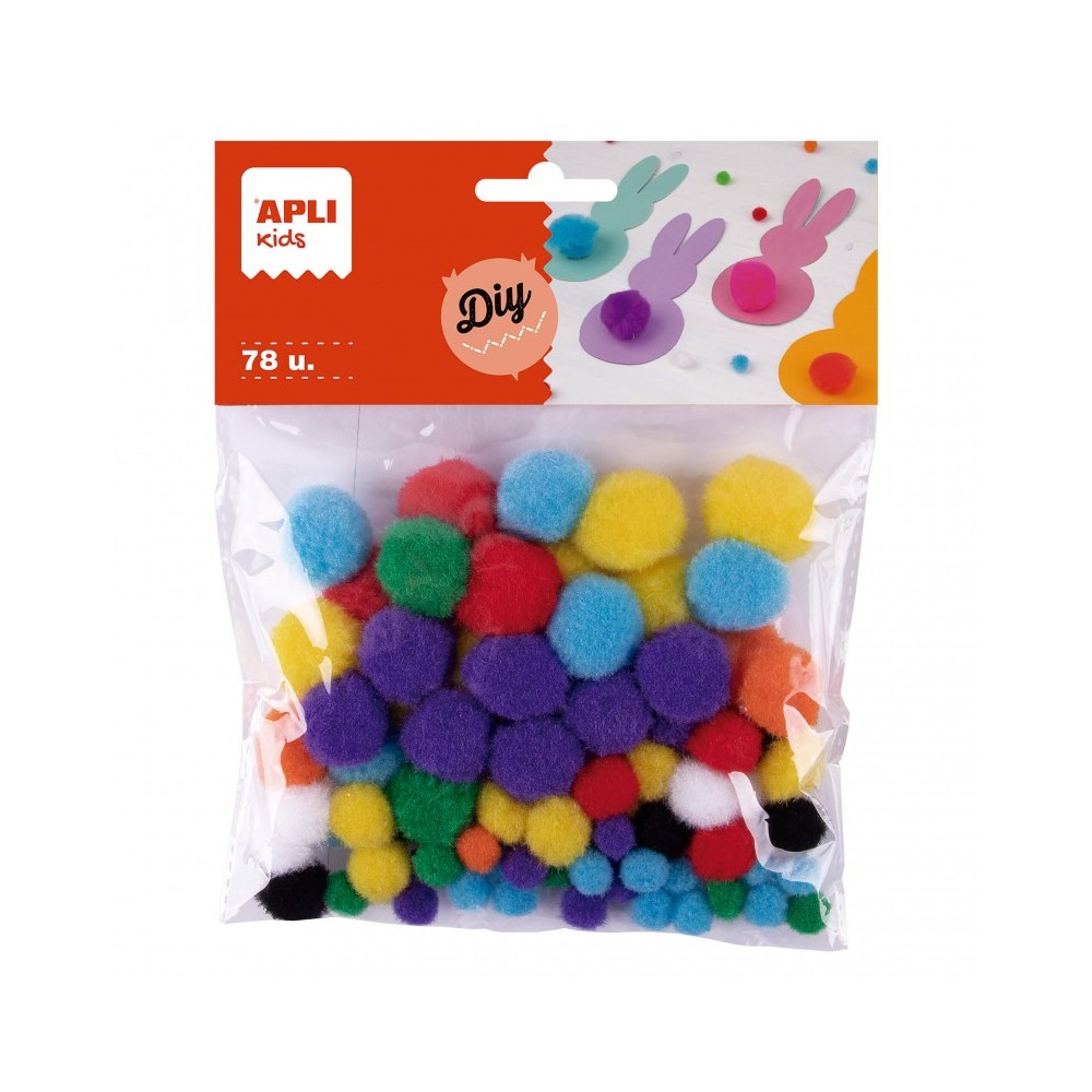 Apli Pack de 78 Pompones - Medidas Surtidas Ø 8 mm, Ø 10 mm, Ø 12 mm, Ø 15 mm y Ø 20 mm - Colores Surtidos