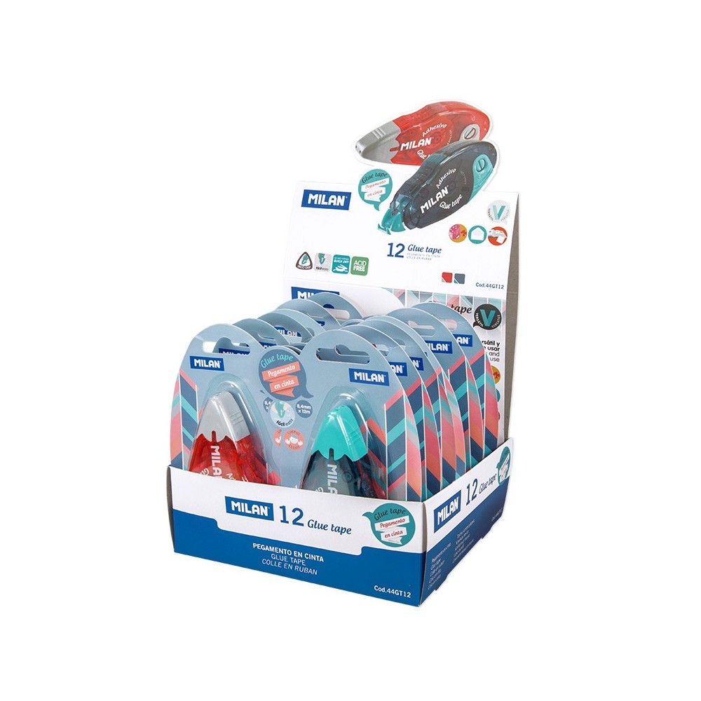 Milan Expositor de 12 Cintas de Pegamento 8,4mm x 12m - Diseño Ergonomico - Secado Rapido - Ideal Manualidades - Colores Surtido