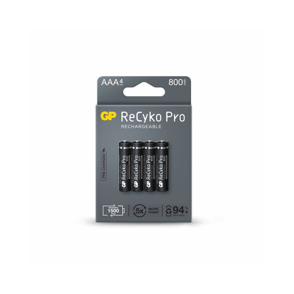 GP ReCyko Pro Pack de 4 Pilas Recargables 800mAh AAA 1.2V - Precargadas - Ciclo de Vida: Hasta 1.500 Veces