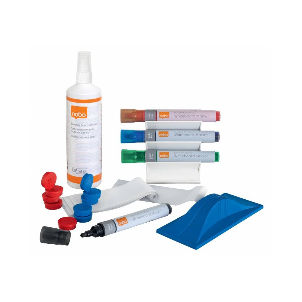 Nobo Kit de Usuario para Pizarra Blanca - Incluye Rotuladores, Borrador, Espray y Paño de Limpieza - Accesorios para Pizarras Bl