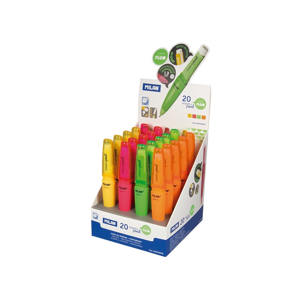 Milan Capsule Fluo Expositor de 20 Portaminas - Mina 1.3mm 2B Grafito - Goma Milan Extra Grande - Colores Surtidos Ver más grande