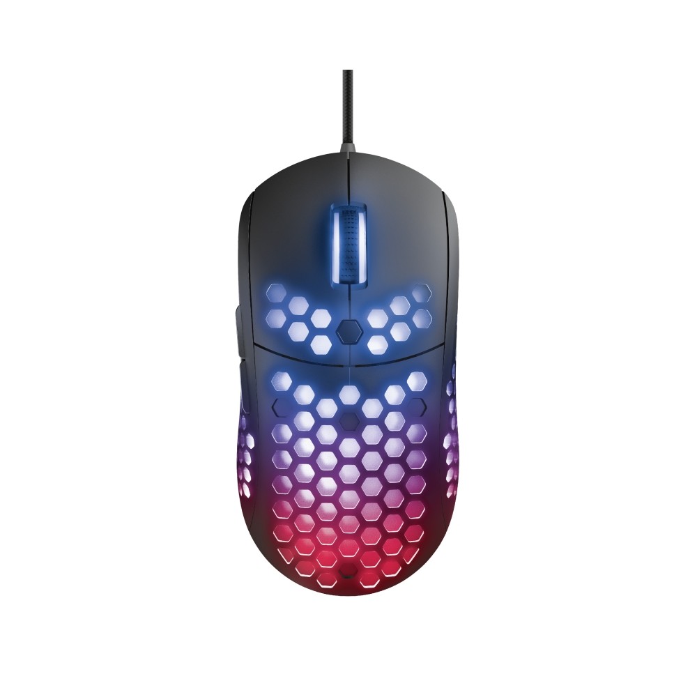 Ligero ratón para gaming, con iluminación RGB y carcasa perforada.
