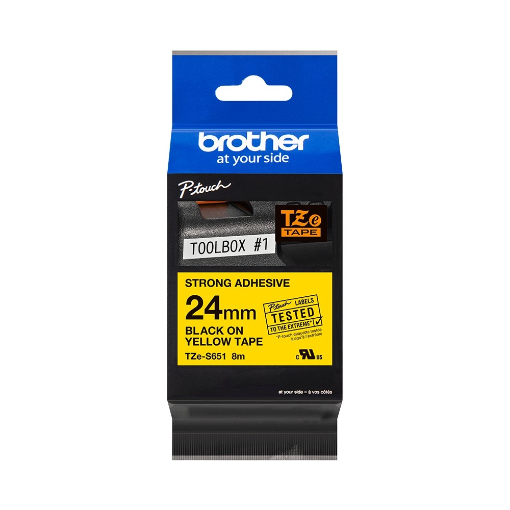 Brother TZeS651 Cinta Laminada Super Adhesiva Original de Etiquetas - Texto negro sobre fondo amarillo - Ancho 24mm x 8 metros