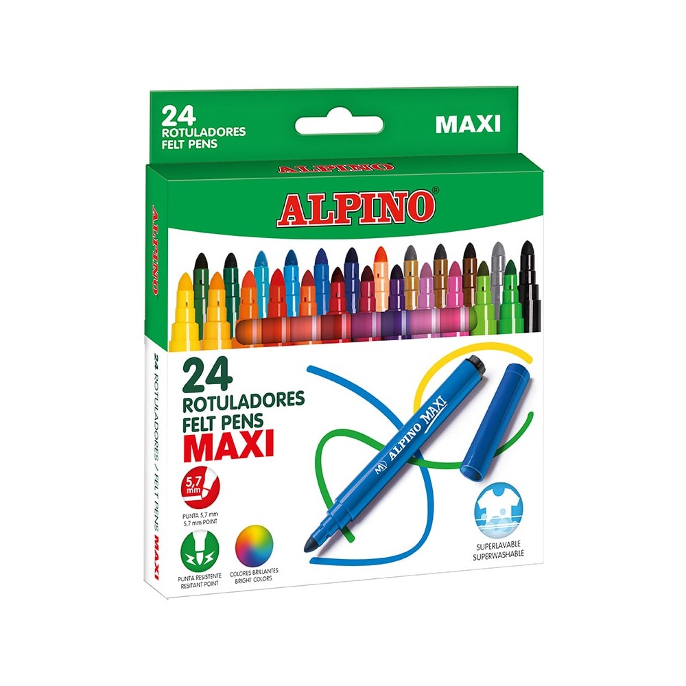 El Alpino Estuche 24 rotuladores gruesos Maxi es un estuche de 24 rotuladores gruesos con punta de 6 mm. Estos rotuladores son súperlavables, resistentes, duraderos y de colores brillantes. Son ideales para iniciar a los niños en la técnica de pintado con rotulador. Además, están especialmente diseñados para uso escolar ya que permiten un pintado fácil desde cualquier ángulo aportando unos colores vivos que animan al niño a seguir con sus creaciones. El surtido de colores es variado y atractivo.