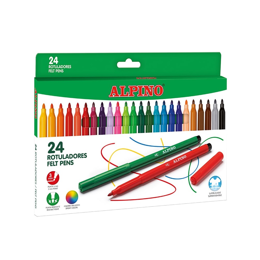 Alpino Pack de 24 Rotuladores Escolares - Punta Fina de 3mm - Superlavables y Brillantes - Desarrolla la Creatividad - Colores S