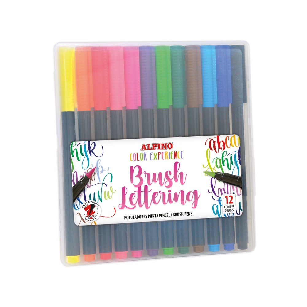 Alpino Color Experience Pack de 12 Rotuladores Brush Lettering - Punta Pincel de 4.55mm - Tinta Base Agua - Colores Vivos y Bril