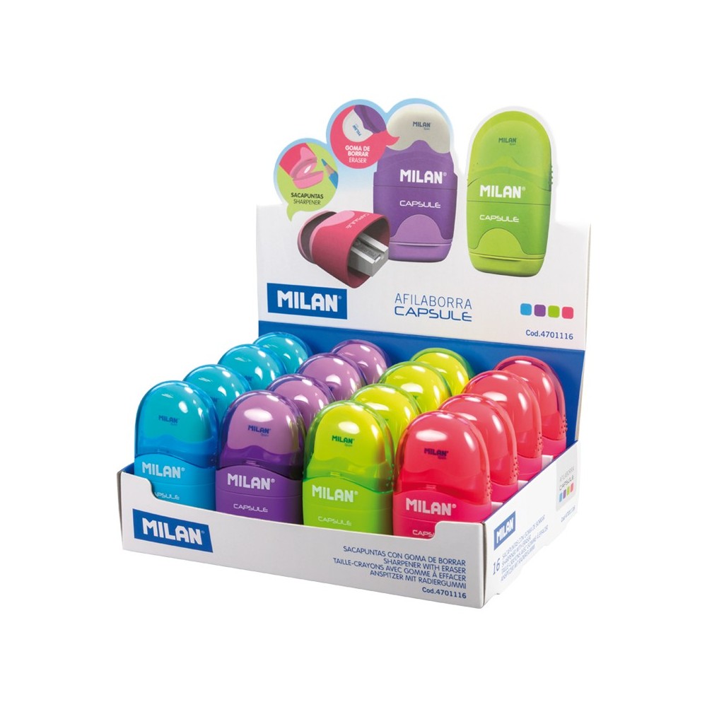 Milan Capsule Expositor de 16 Afilaborras - Cuchilla de Acero - Goma de Borrar - Cuchilla de Seguridad - Colores Surtidos