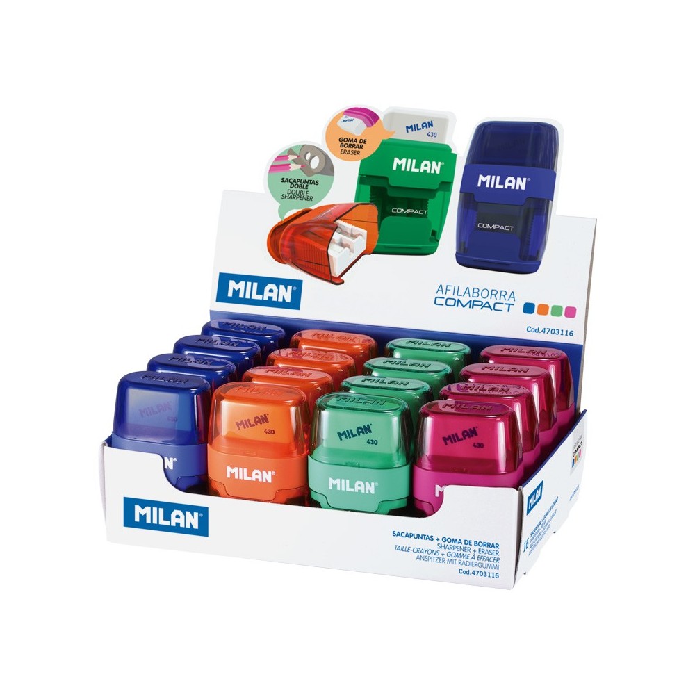 Milan Compact Expositor de 16 Afilaborras - Uso Estandar y Maxi - Cuchilla de Acero - Goma de Borrar - Cuchilla de Seguridad - C