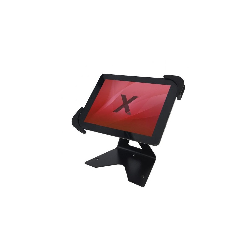 Soporte universal adaptable a todas las tablets del mercado de 10.2 a 12.9 mediante muelles laterales extensibles. Dispone de un sistema antirrobo con llave y base con perforaciones para su anclaje en cualquier superficie plan.