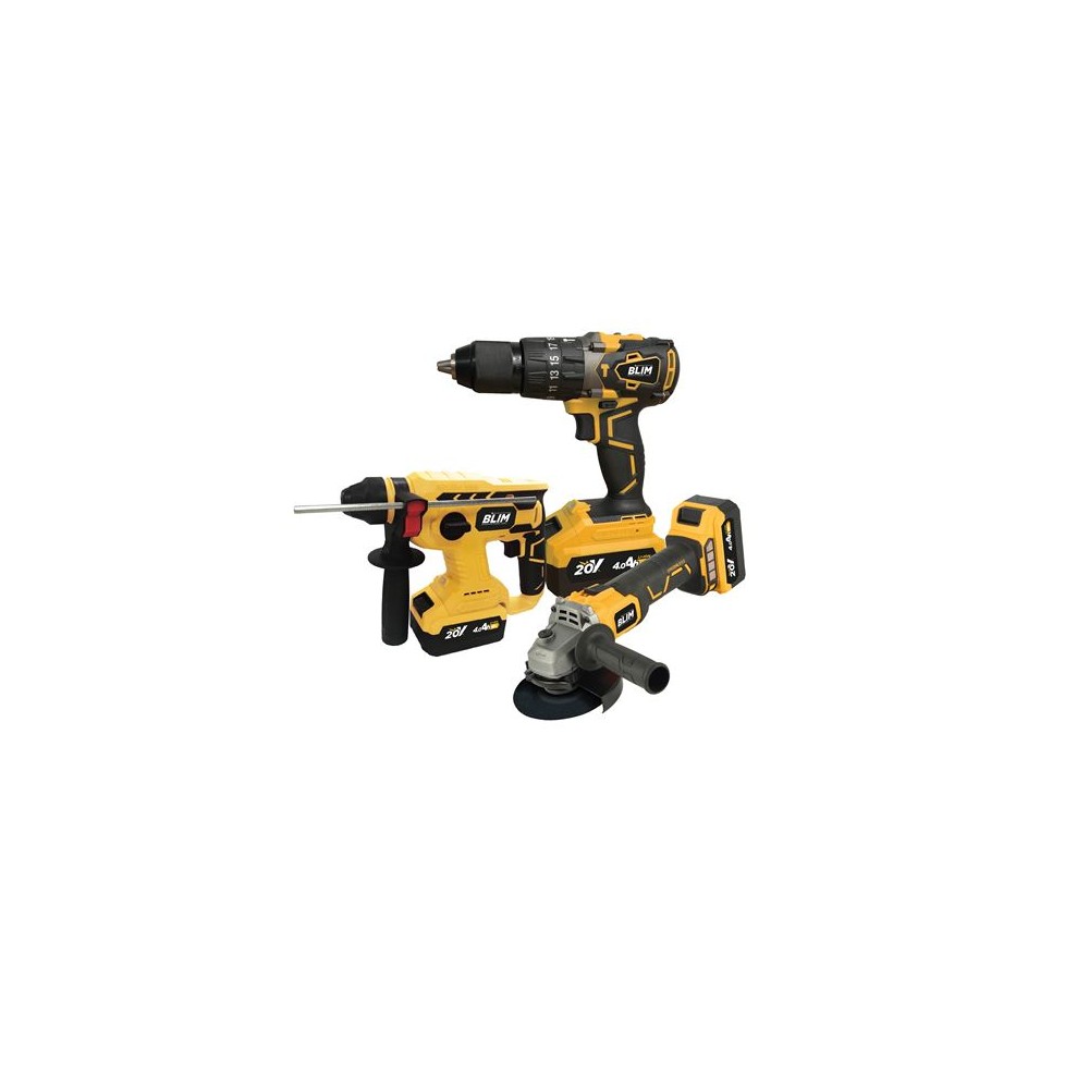 Blim Pack Radial a Bateria 115mm 20V 4Ah + Taladro Percutor 20V 4Ah + Martillo Perforador 20V 4Ah