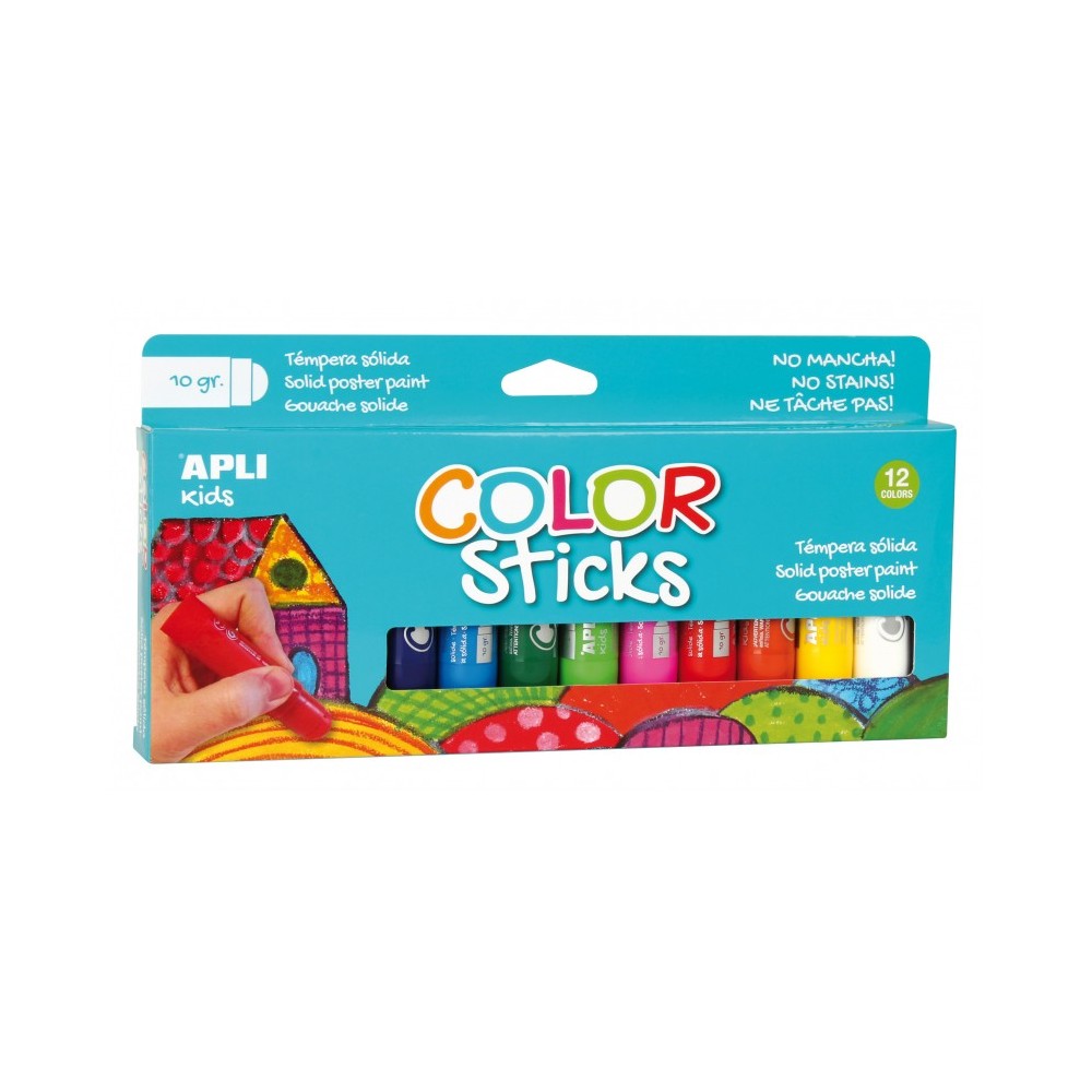 Témperas sólidas Color Sticks. Pack con 12 unidades de 10 g en colores surtidos: blanco, amarillo, naranja, rojo, rosa, verde, verde oscuro, azul, azul oscuro, lila, marrón y negro. Ideales para dibujar y pintar sobre papel, cartón, cartulina, etc. Los Color Sticks de APLI no manchan; tienen un acabado satinado, por lo que no necesitan barniz; y secan rápidamente, en menos de 3 minutos. Colores nítidos, vivos e intensos. Puedes conseguir distintos acabados según la presión ejercida: poca presión = efecto cera; mucha presión = efecto témpera. Una vez finalizado el dibujo, no se quiebra, se mantiene flexible. No contienen disolventes. Recomendado para niños a partir de 3 años.
