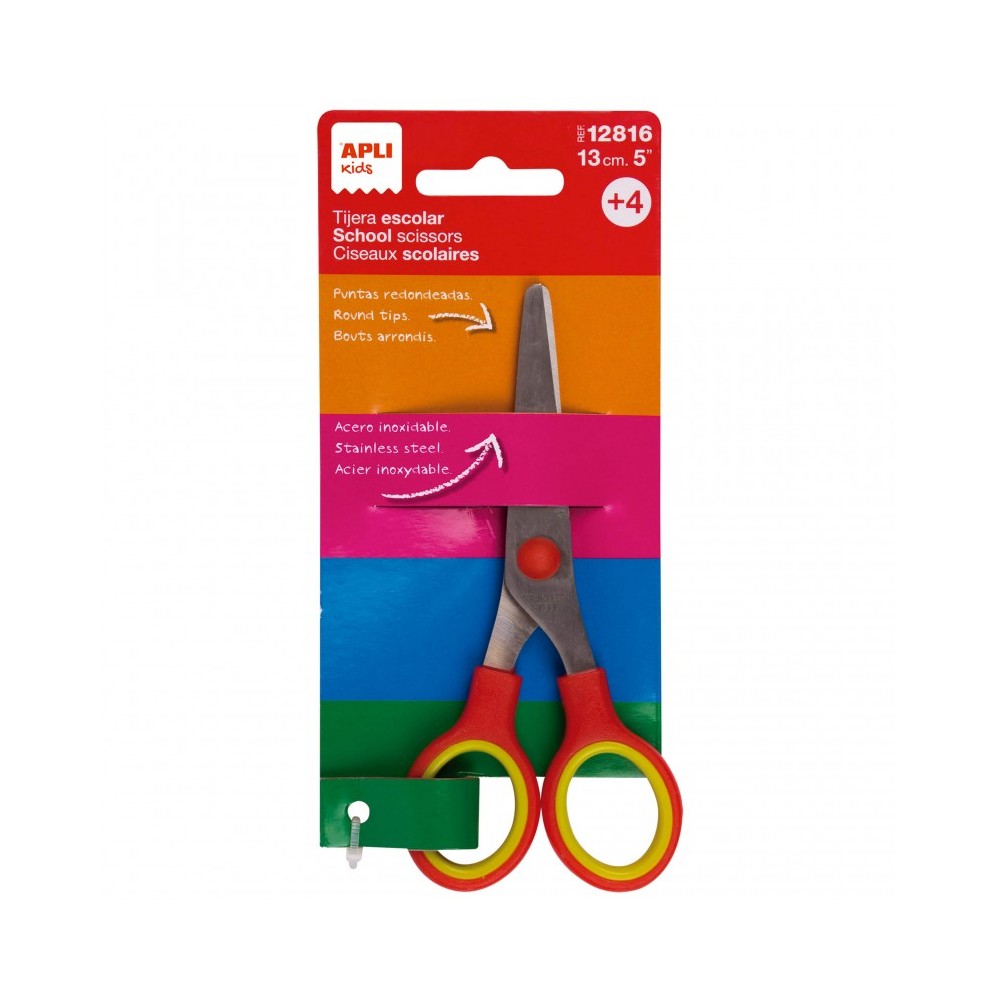 Tijera escolar de color rojo y amarillo de tamaño 13 cm. Apta para niños a partir de 4 años. Punta redondeada, no punzante, para una mayor seguridad. Tijera ergonómica para uso ambidiestro. Aros simétricos de plástico ABS y hojas de acero inoxidable. Excelente calidad y durabilidad. Corta todo tipo de material: papel, cartón, goma EVA, fieltro, etc. Ideales tanto para uso escolar como doméstico.