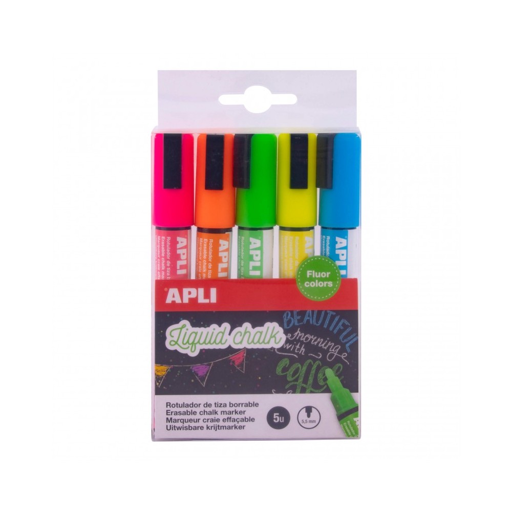 Apli Pack de 5 Rotuladores de Tiza Liquida Punta Redonda - Punta 5.5 mm - Secado Rapido - Colores Surtidos